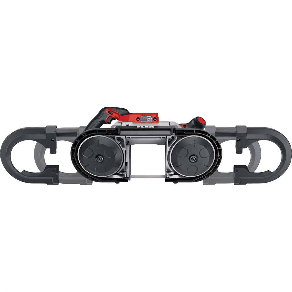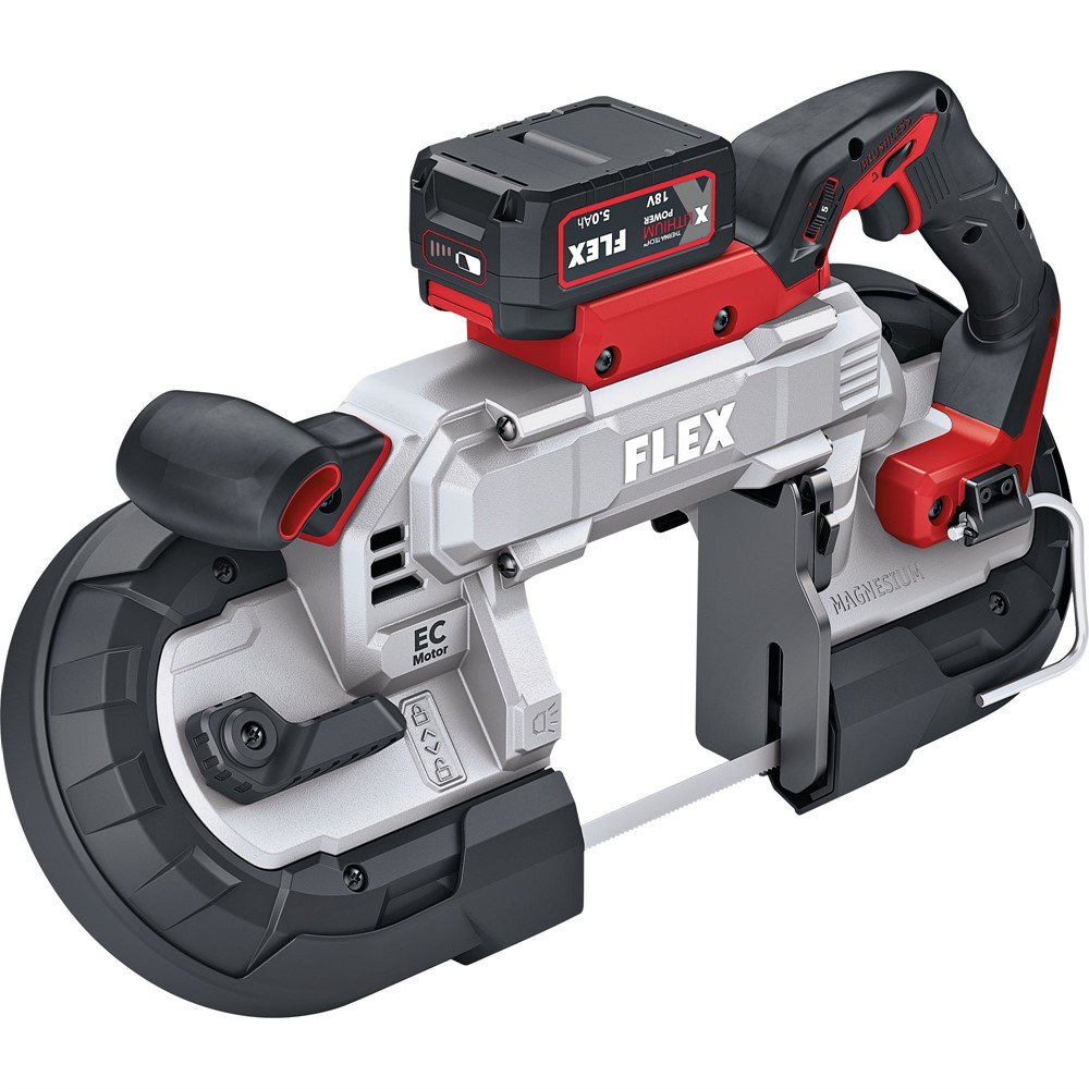Det elektroniska styrsystemet (EMS) skyddar maskinen, förlänger dess livslängd och ökar den totala effektiviteten. En LED-display visar aktuell batterikapacitet. Bandsågen är en del av FLEX batterisystem och är kompatibel med alla FLEX 18 V batterier.