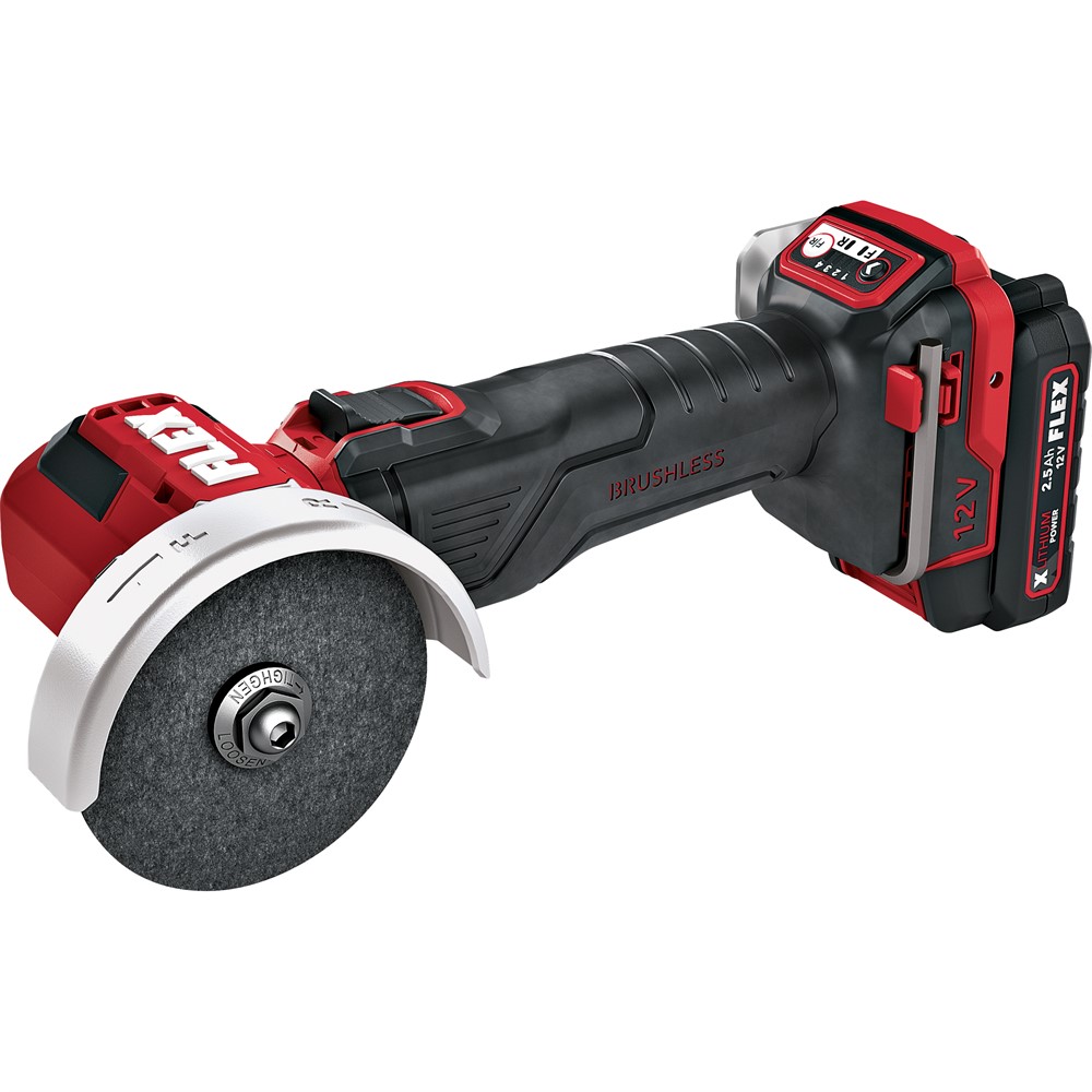 En LED-display visar aktuell batterikapacitet. Minivinkelslipen är en del av FLEX batterisystem och är kompatibel med alla FLEX 12 V batterier.