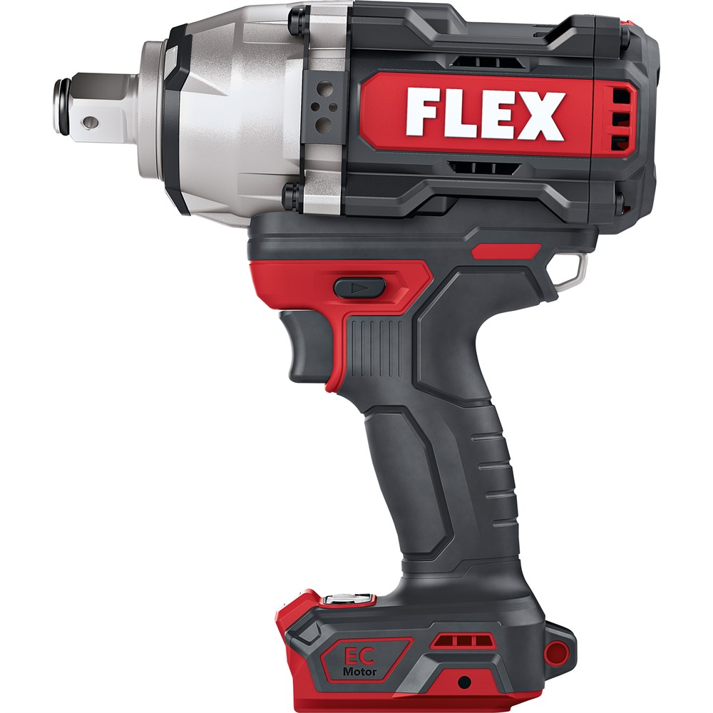 Arbetsområdet belyses effektivt av en integrerad LED-belysning som kan ställas in i fem olika steg. Verktyget är försett med ett robust 3/4″ verktygsfäste för slaghylsor och en steglös brytare med spärrknapp för bekväm användning. Säkerhet och kontroll garanteras med höger- och vänsterrotation samt en integrerad säkerhetsspärr och ett elektroniskt snabbstopp. Ergonomin är väl genomtänkt med ett fribärande handtag som har en greppyta av gummi. Vibrationer reduceras effektivt genom ett fjädrande spjäll och ytterligare vibrationsdämpning mellan maskinhuset och handtaget, vilket minskar belastningen på användaren. En tydlig LED-display informerar om batterikapaciteten. Mutterdragaren är en del av FLEX batterisystem och är därmed kompatibel med alla FLEX 18 V batterier. Notera att leverans sker utan batteri och snabbladdare.