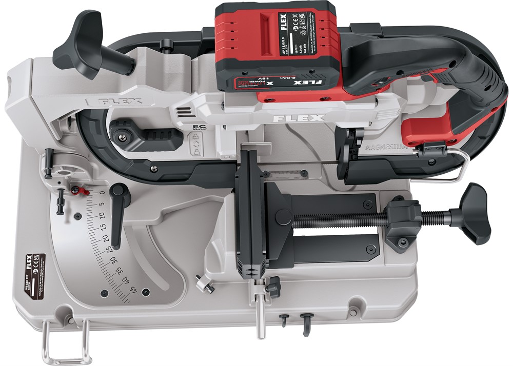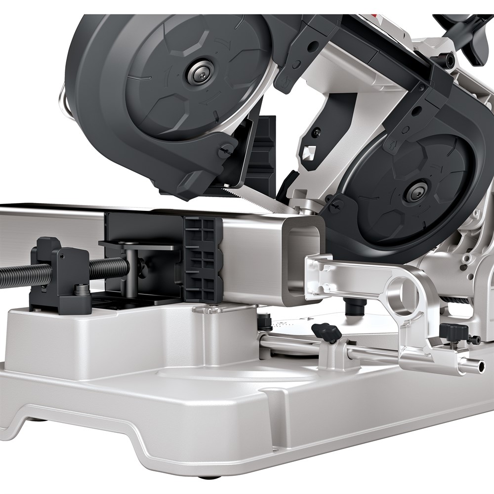 Sågens arm är fjäderbelastad, vilket effektivt stödjer bandsågens vikt och underlättar hanteringen. En tydlig skala möjliggör vinkelinställning från 0–45° för exakta snitt.