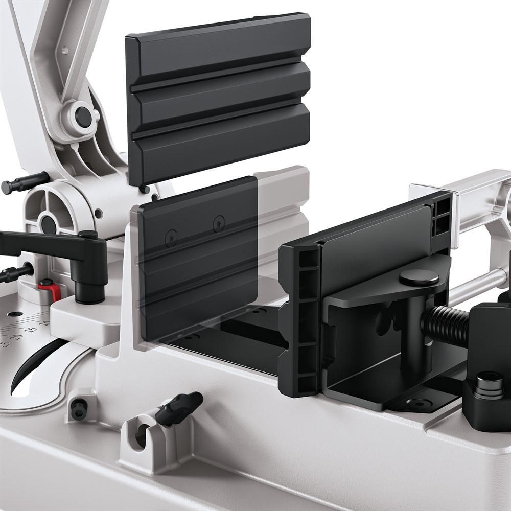 Inkluderar ett robust skruvstäd med specialdesignade insatsbackar för att säkert och skonsamt fixera både rör och andra profiler med känsliga ytor under bearbetning.