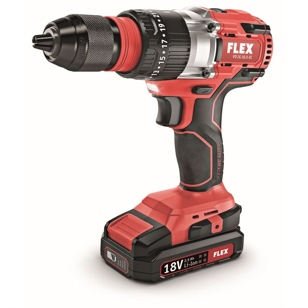 Leveransen inkluderar extrahandtag, bälteshållare och bitsförvaring. Maskinen är en del av FLEX batterisystem och är kompatibel med alla FLEX 18,0 V batterier.